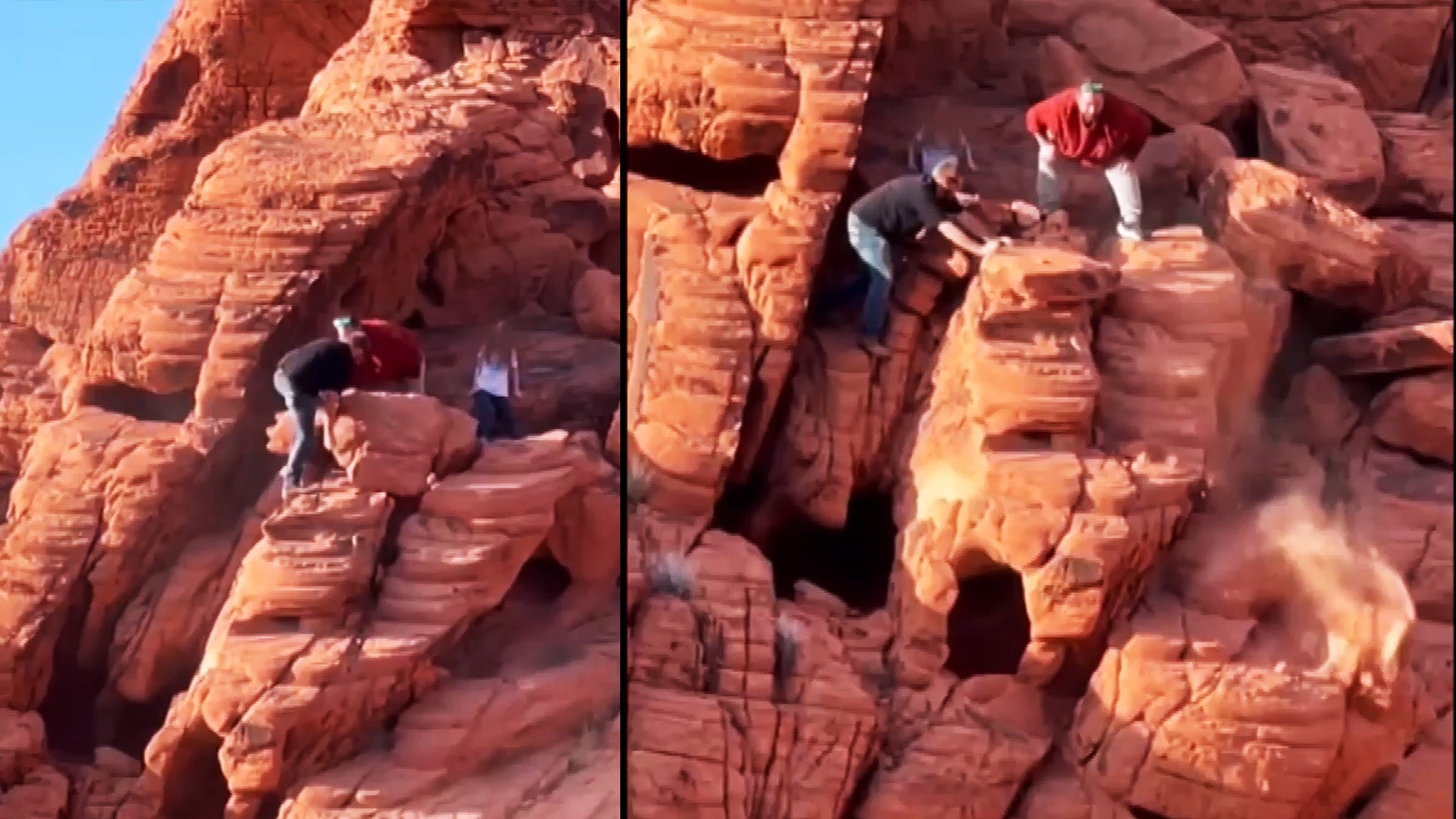 A group of men were caught on video pushing over a rock formation inside a national park. Park rangers are asking for the public’s help in tracking them down.