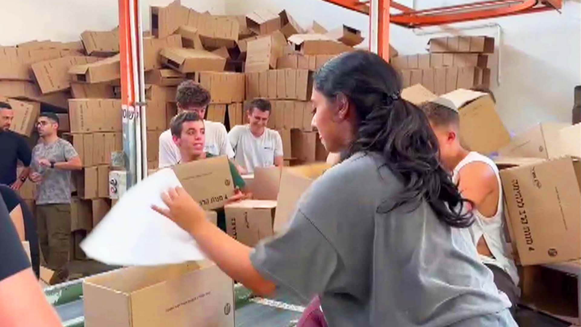 The two are now volunteering by stuffing boxes of food for Israeli soldiers.
