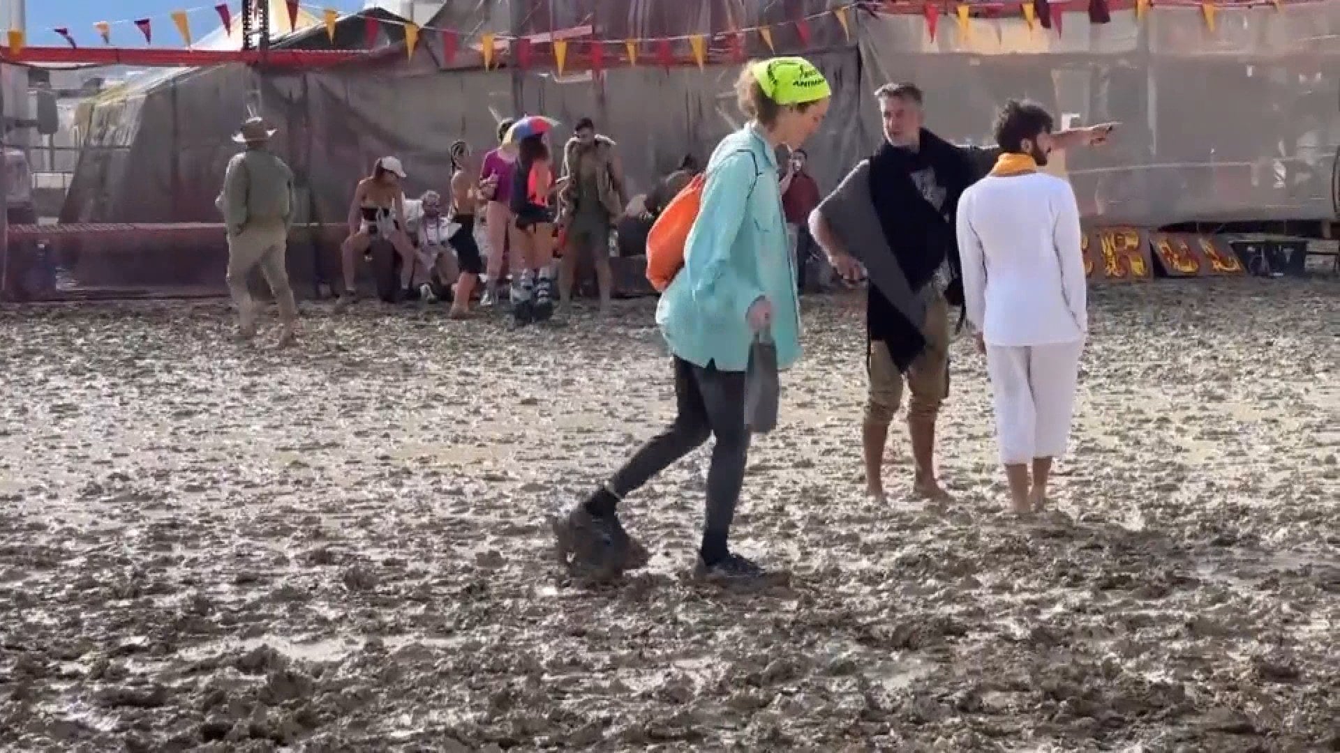 That meant hours of slogging through muck as roads were overrun and festivalgoers tried to pry themselves from knee-deep mud that pulled off shoes and forced some to tie plastic bags over their feet in an effort to keep moving.