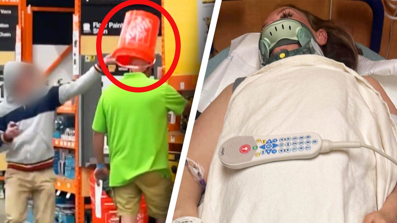 When the bucket prank happened at a Target in Orange County, California, the result had very serious consequences. When the bucket was placed over one mom' s head, she collapsed to the ground and she says it triggered a serious heart condition.