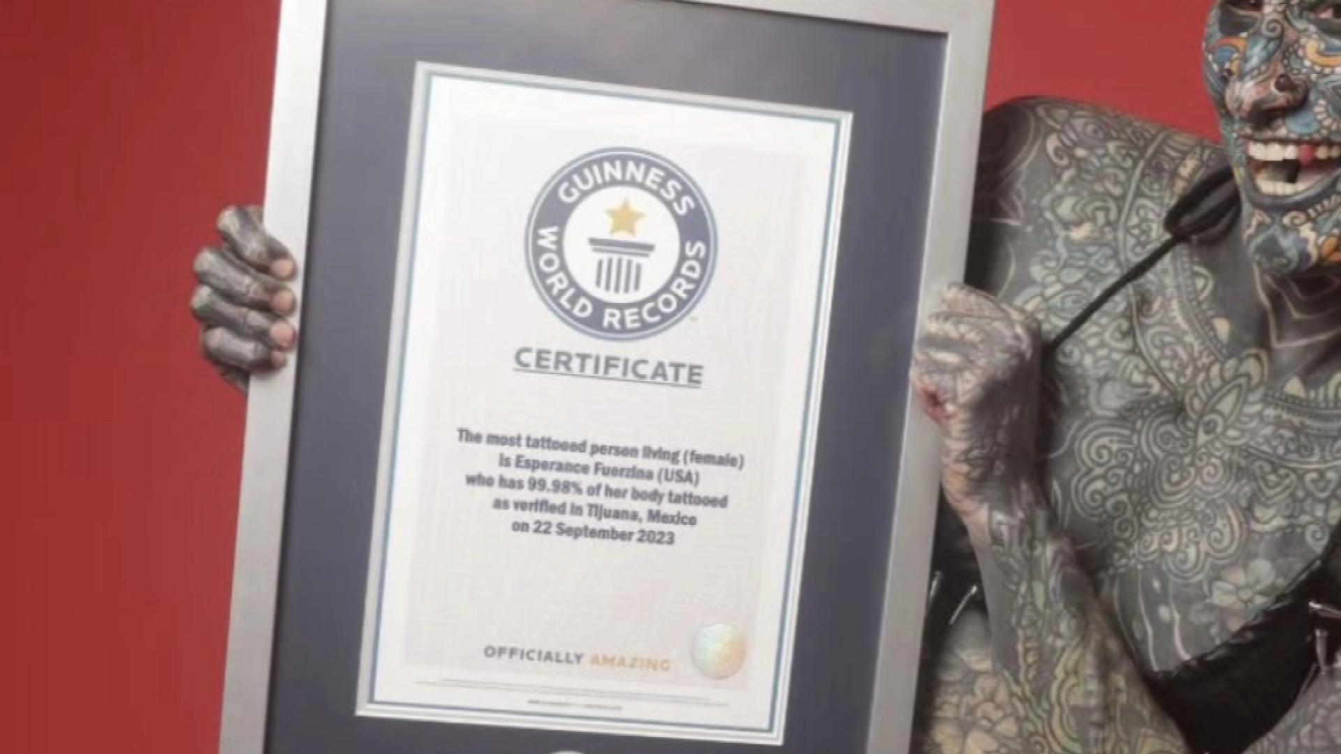 Esperance Lumineska Fuerzina is officially holds two Guinness World Records. She has the most tattoos of any woman in the world, with 99.8% of her body covered. She also has the most body modifications of any woman in history: 89.