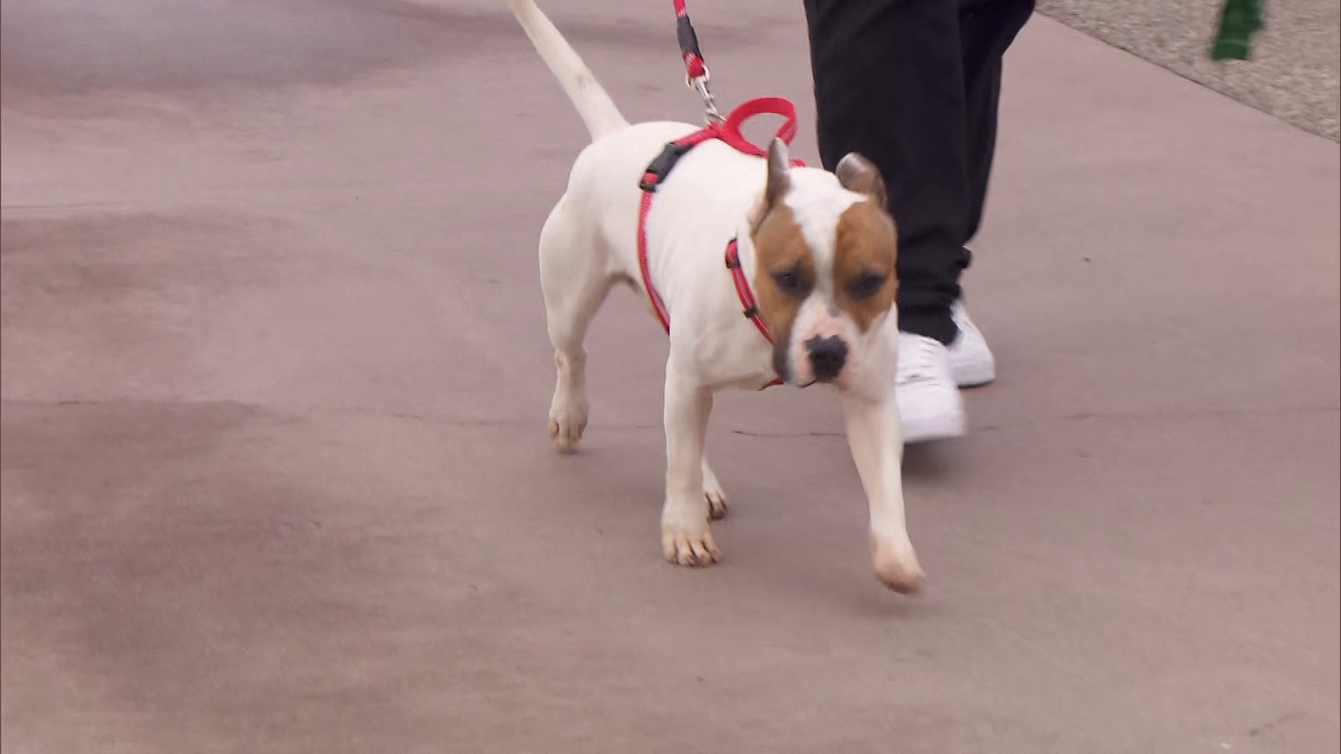 The bull terrier mix, now named Chico, is getting the love and care he deserves from Gomez and Moran.