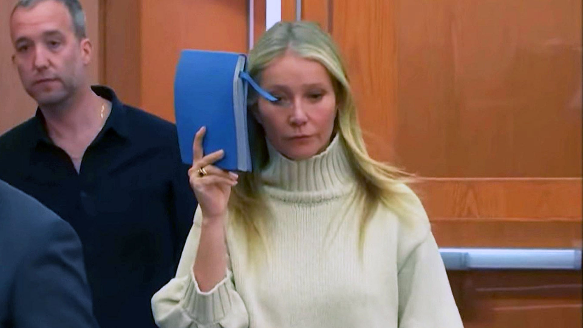 At the midway point on Tuesday, Paltrow was seen shielding her face with her notebook as she exited the courtroom at one point.