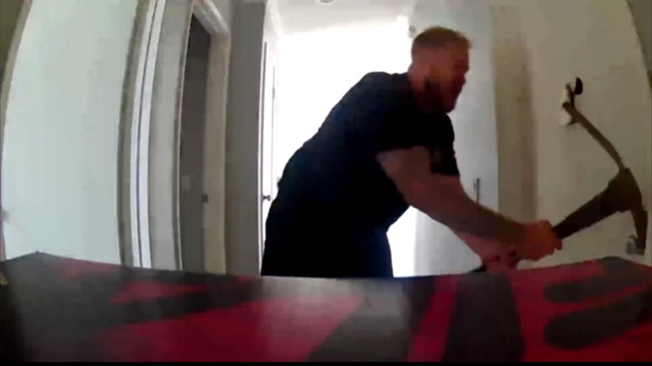 In an attack that evoked scenes from "The Shining," a California man was arrested after he chased people with a pickaxe and hacked open a bedroom door as his cowering roommate screamed for help, authorities said.