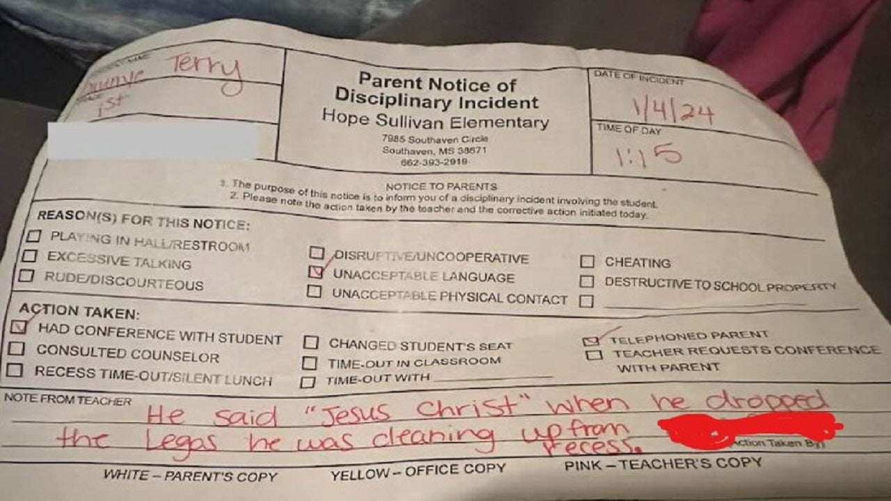The child's offense, according to a handwritten note on the form: "He said 'Jesus Christ' when he dropped the Legos he was cleaning up from recess."