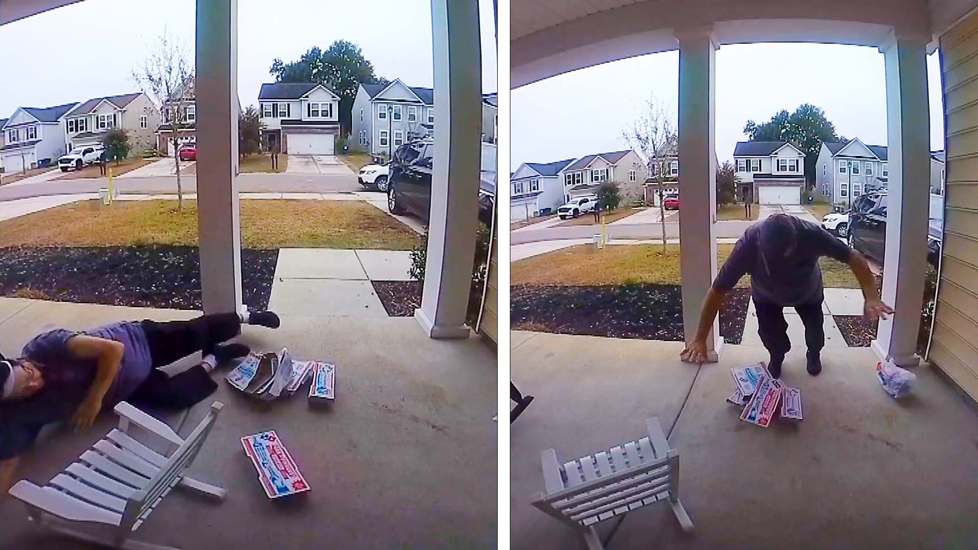 The fall was captured on the couple's Nest cam, and showed that the delivery worker's concern at the time was that she had ruined their food.