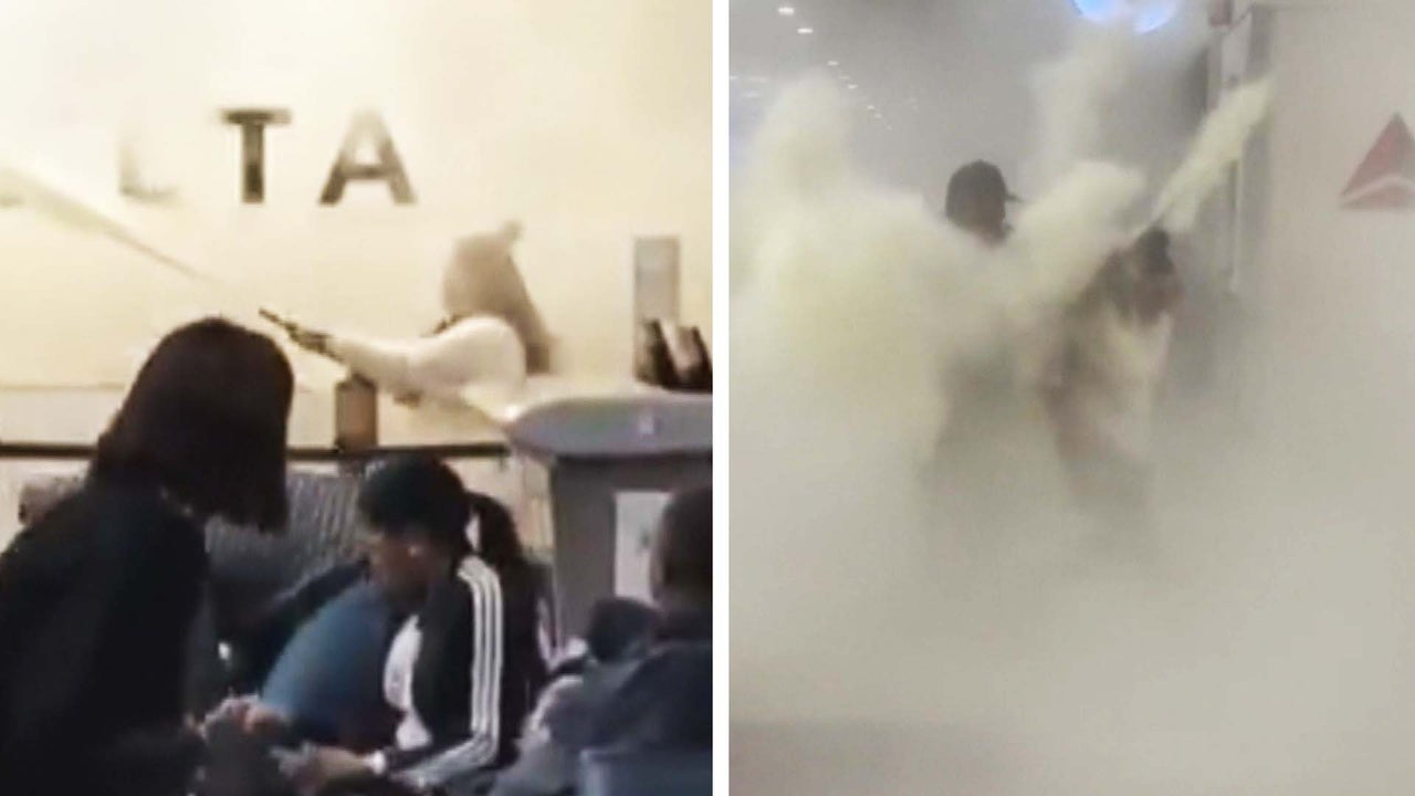 Holder, 28, then walks through the terminal blasting anyone who gets in her way while holding the extinguisher like a rifle.