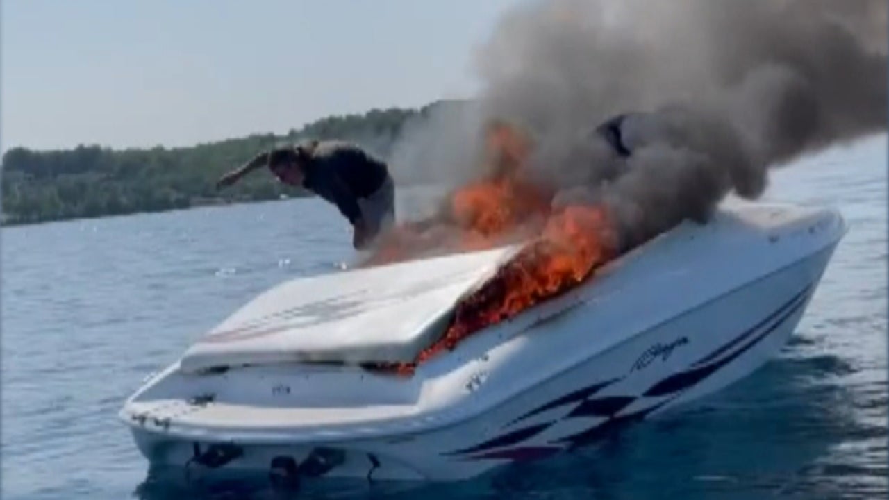 Two men stranded on a boat in Lake Michigan are engulfed in flames, then jump overboard just seconds before the vessel explodes.