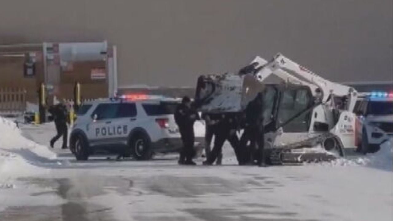 The driver rammed into a police car and smashed the doors of a liquor store while driving a snow plow, according to video of the aftermath.