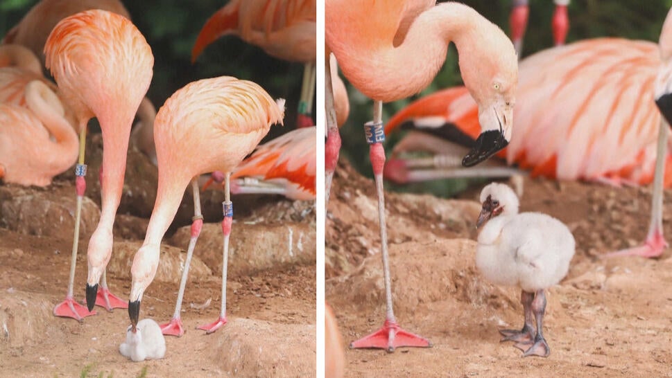 Curtis and Arthur, a same-sex pair of Chilean flamingos, adopted an abandoned egg and are now raising the chick together at the UK's Paignton Zoo.