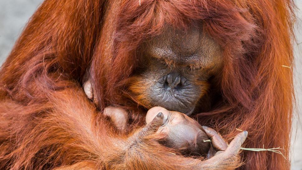 Mama Orangutan Can't Stop Holding Her Newborn Baby