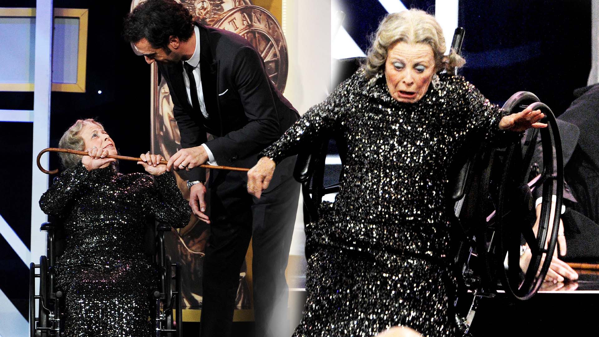 The crowd was told that Chaplin’s last surviving costar was there to deliver the award, which was the woman in the wheelchair Baron Cohen went on to push off the stage.