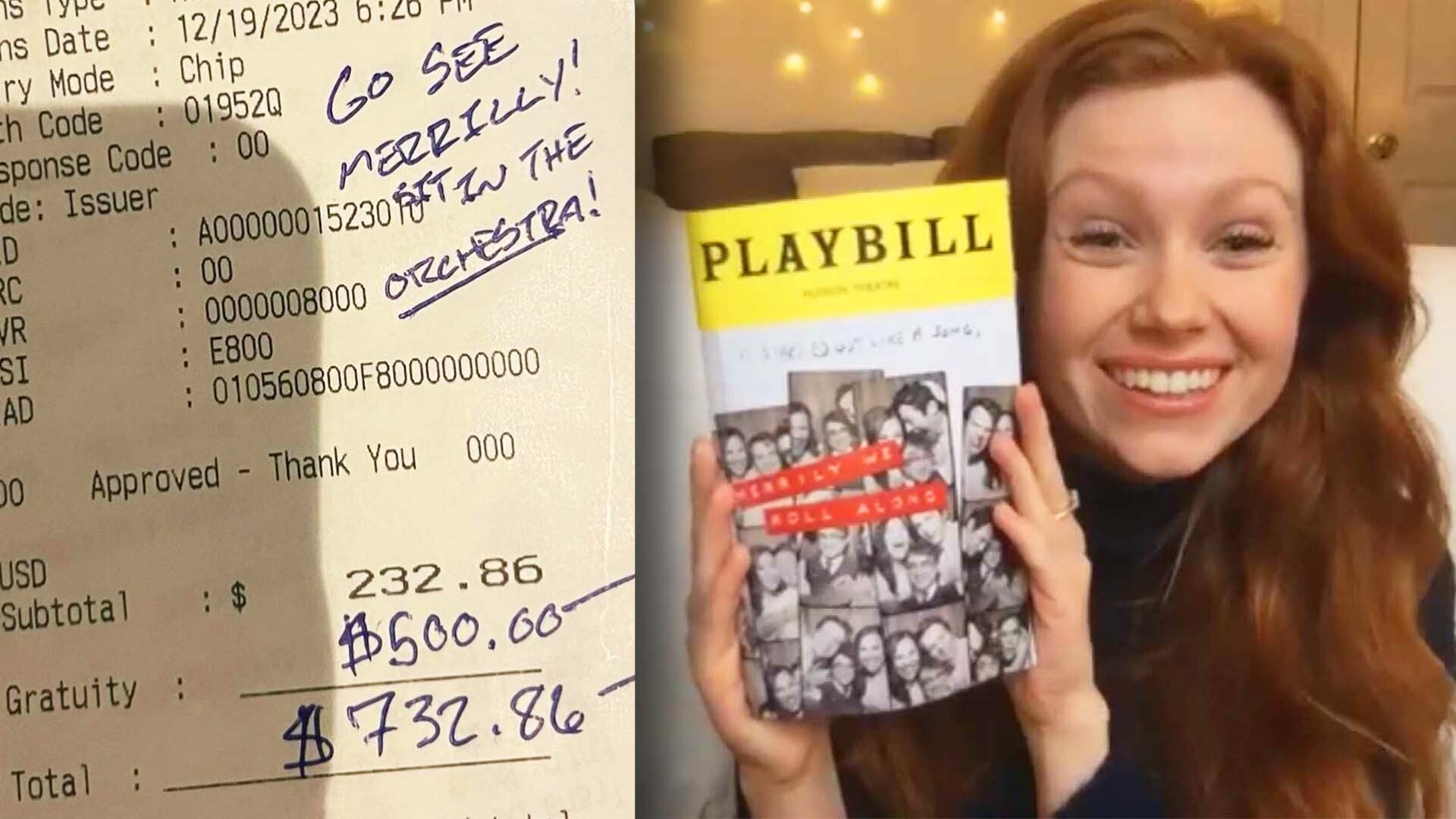 The customers had left her a $500 tip on their $231 bill with a note that read, “Go see Merrily. Sit in the orchestra!”